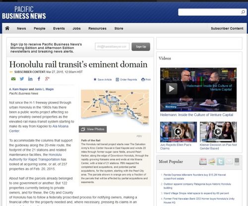 The cover story in Pacific Business News‘ recent edition, “Honolulu rail transit’s eminent domain” is worth reading. Most importantly, the PBN staff created maps which show how much property is targeted for acquisition, and where it is located, precisely. Yes, the full story is behind a partial paywall, but as we said last week, if you are in Honolulu you really should be a PBN subscriber. Plus, there are a few quotes from our side in the piece:
