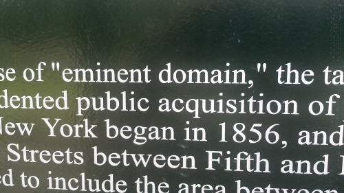In addition to acknowledging the early history of Seneca Village, the sign also relates how “eminent domain” (why the unnecessary quotation marks, we can’t say) was used to dispossess the owners of their property to make way for the Park: