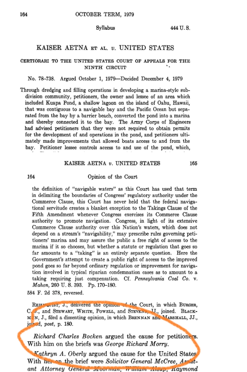 No better example of that than his challenging established law and eventually winning in the U.S. Supreme Court the (now) well-known and oft-cited case, Kaiser Aetna v. United States, 444 U.S. 164 (1979). This was a time before the rise of the specialized SCOTUS Bar and the Court’s shrinking docket, where even lawyers from small firms in small markets could get cases up to the big boys (and yes, back then, the Justices were all men). Not deterred by stacks of seemingly-contrary precedent, he and Diane Hastert pushed and pushed back against the feds, and after a lot of hard work and deep thinking, got the Court to take the case. Unfazed by the surroundings, he argued on opening day, October 1, 1979. More on that here. Thanks to technology, you can listen to his rebuttal argument (with questioning by Chief Justice Berger and Justice Marshall) on Oyez.