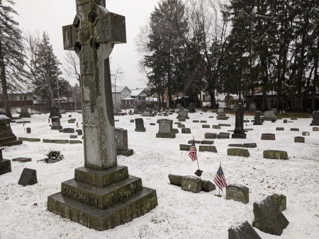 Here, at the Craig-Mahon family plot, he lies in repose with Mrs. Mahon.