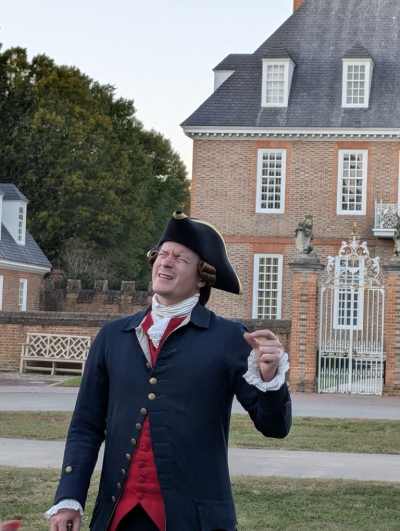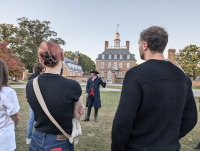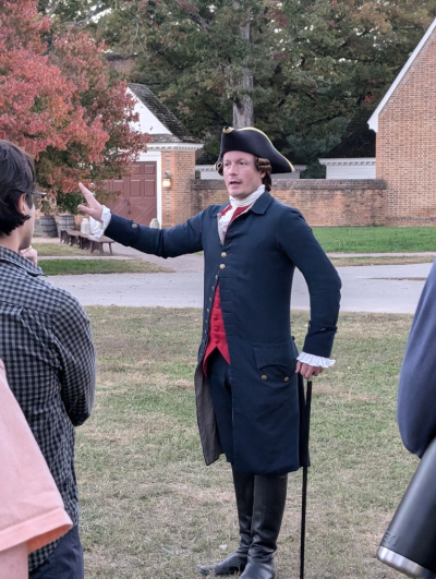 The Society was kind enough to allow me to join them again, and we gathered at the home of Jefferson’s mentor-in-law, George Wythe. After some questions and answers there, we walked a short distance to what is now known as the Governor’s Palace in the heart of CW, but back in Jefferson’s day was the building in which he studied law under Mr. Wythe’s tutelage.