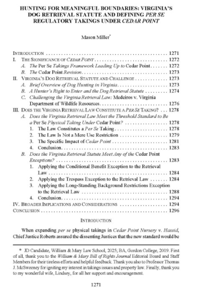 Be sure to read this recently-published piece in the William and Mary Bill of Rights Journal, Mason Miller, “Hunting for Meaningful Boundaries: Virginia’s Dog Retrieval Statute and Defining Per Se Regulatory Takings Under Cedar Point,” 33 Wm. & Mary Bill of Rights J. 1271 (2025).