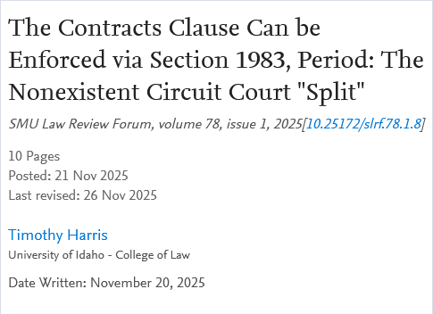 Check out a newly-published law review article by lawprof Timothy Harris, “The Contracts Clause Can be Enforced via Section 1983, Period: The Nonexistent Circuit Court ‘Split’,” 78 SMU L. Rev. Forum 106 (2025).